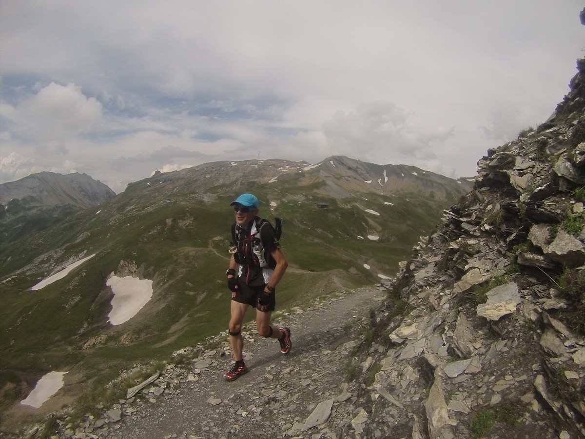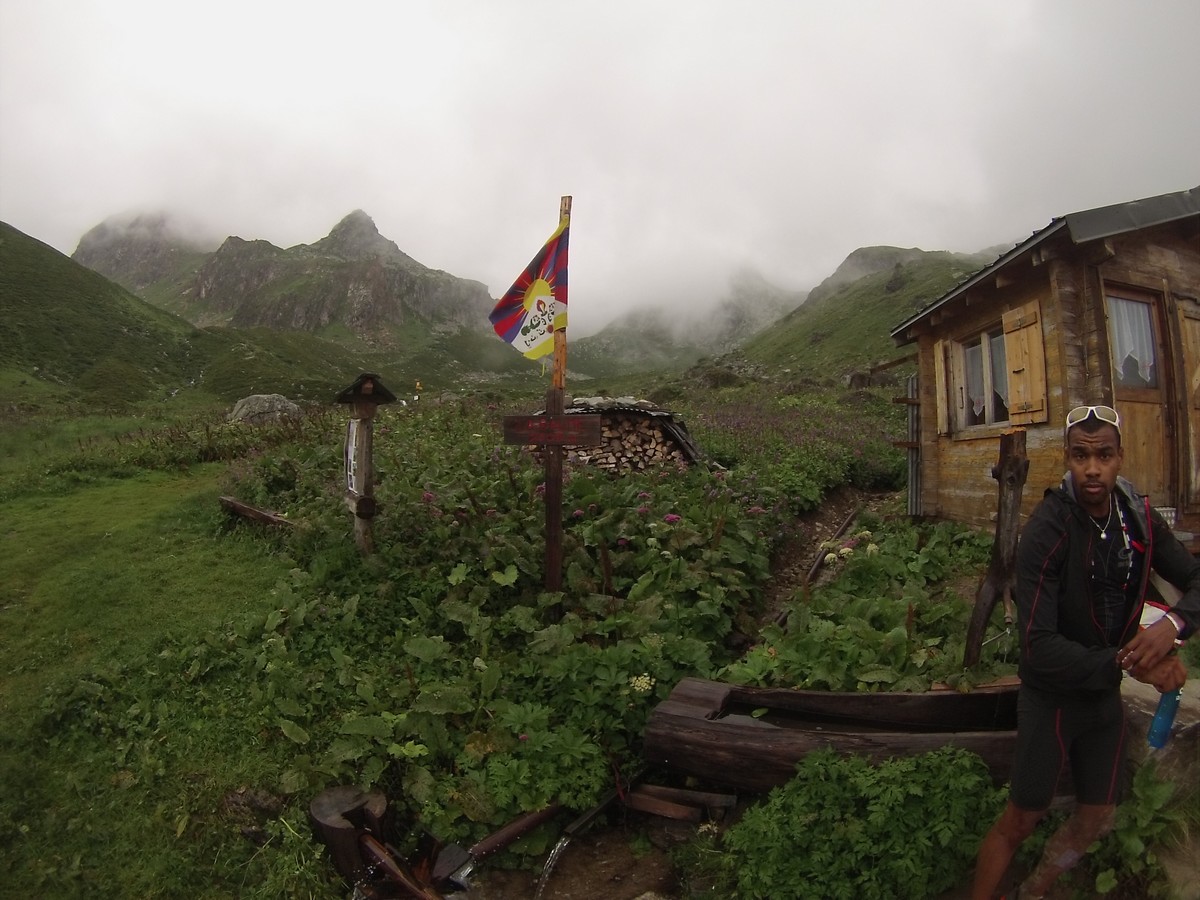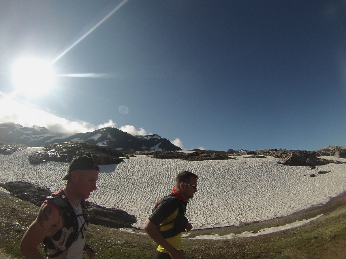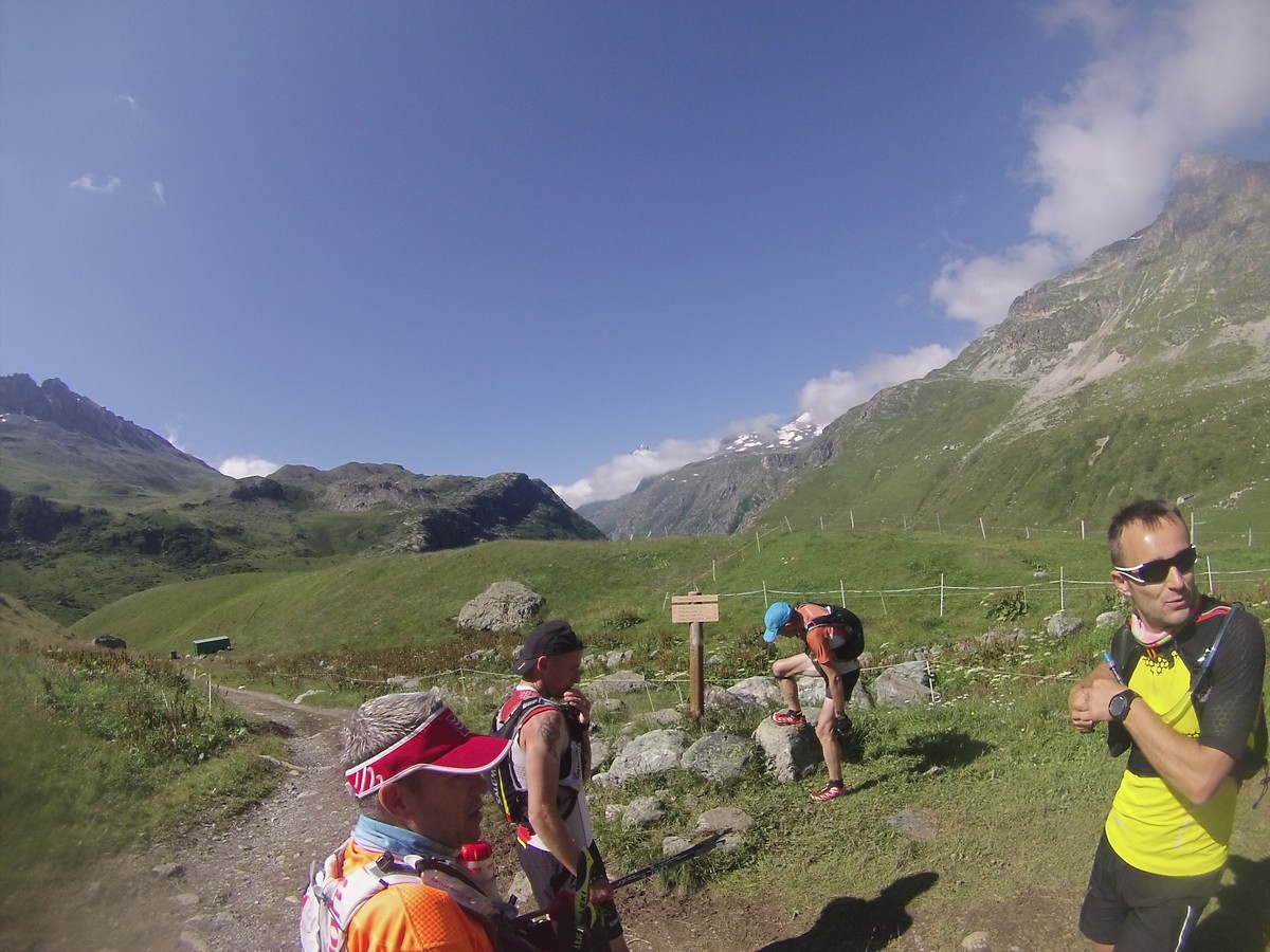 Reveil sous la pluie et les nuages. La journée va être moins amusante. On rejoint la Pierra Menta dans une ambiance bien humide. On ne voit pas ce cailloux mythique mais je le cocherai quand même dans ma feuille : A faire un jour ! Petite pause café au refuge de La Balme. Puis descente vers bellentre pour la pause midi. Nous repartons et au bout de 20′ nous nous retrouvons sur du balisage 6000D. On regarde passé 2 coureurs…je me dis qu’avec un peu de chance je verrai Samuel ou Rudy ou Damien ou Jean-Louis qui courent cette course (et que je coache)… et là la coup de bol : ”salut Christophe.”. Rudy fini les 9 derniers kilomètres et lutte pour rester dans les 200. Trop cool. Longue traversée pour rejoindre le refuge de Rosuel et rentrer dans le parc de la Vanoise. Nous montons sous des nuages menaçants le col du Palet avant de descendre à Tignes. C’est moche de finir la journée au milieu de ces immeubles.