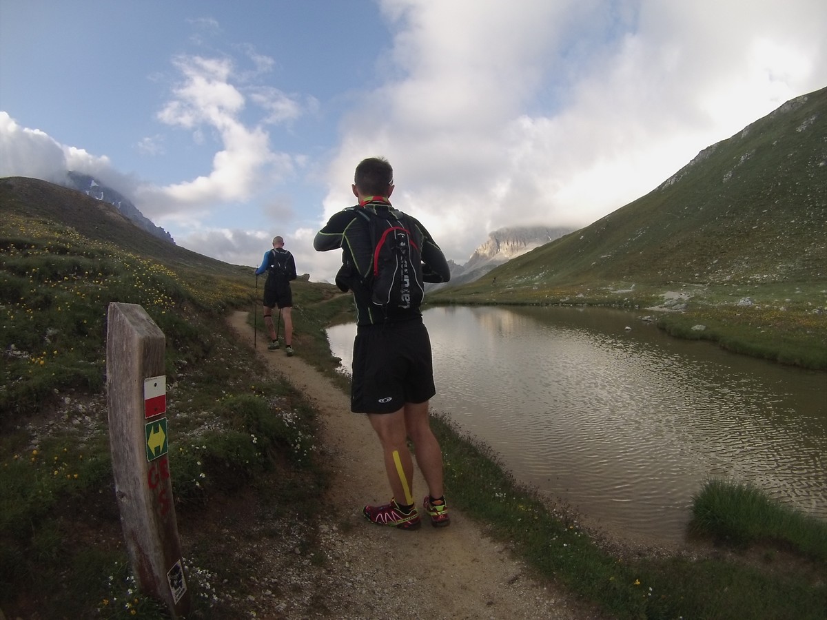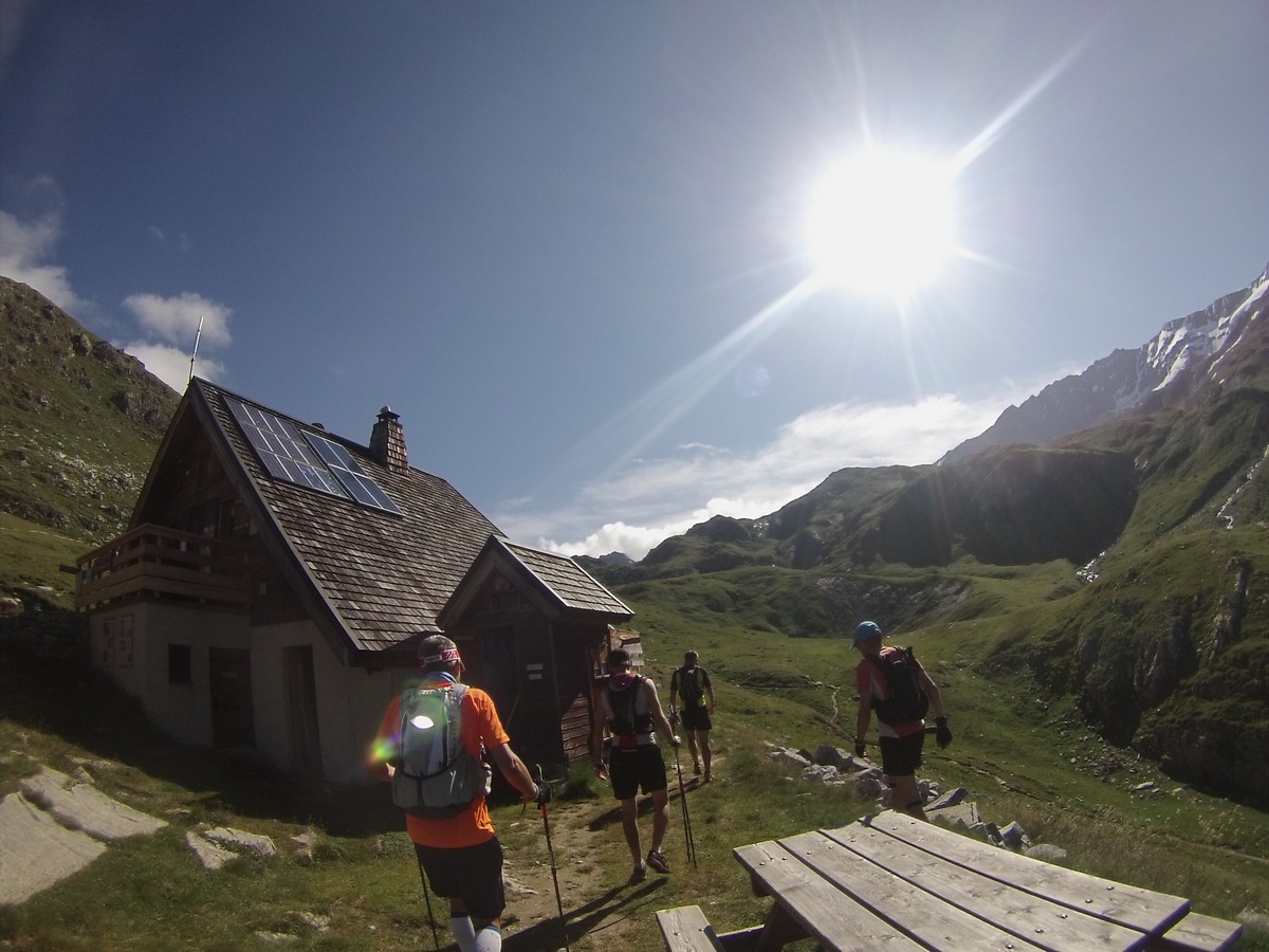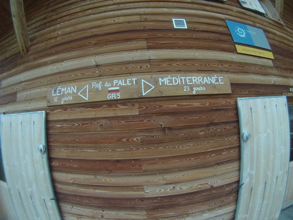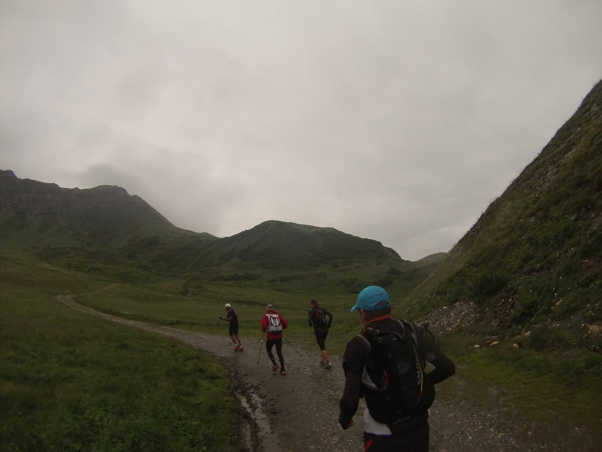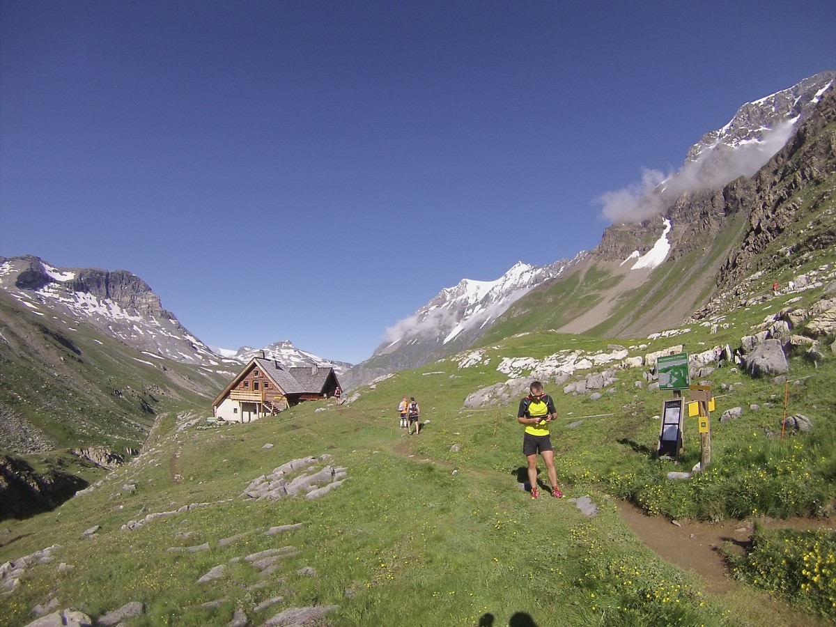 Reveil sous la pluie et les nuages. La journée va être moins amusante. On rejoint la Pierra Menta dans une ambiance bien humide. On ne voit pas ce cailloux mythique mais je le cocherai quand même dans ma feuille : A faire un jour ! Petite pause café au refuge de La Balme. Puis descente vers bellentre pour la pause midi. Nous repartons et au bout de 20′ nous nous retrouvons sur du balisage 6000D. On regarde passé 2 coureurs…je me dis qu’avec un peu de chance je verrai Samuel ou Rudy ou Damien ou Jean-Louis qui courent cette course (et que je coache)… et là la coup de bol : ”salut Christophe.”. Rudy fini les 9 derniers kilomètres et lutte pour rester dans les 200. Trop cool. Longue traversée pour rejoindre le refuge de Rosuel et rentrer dans le parc de la Vanoise. Nous montons sous des nuages menaçants le col du Palet avant de descendre à Tignes. C’est moche de finir la journée au milieu de ces immeubles.