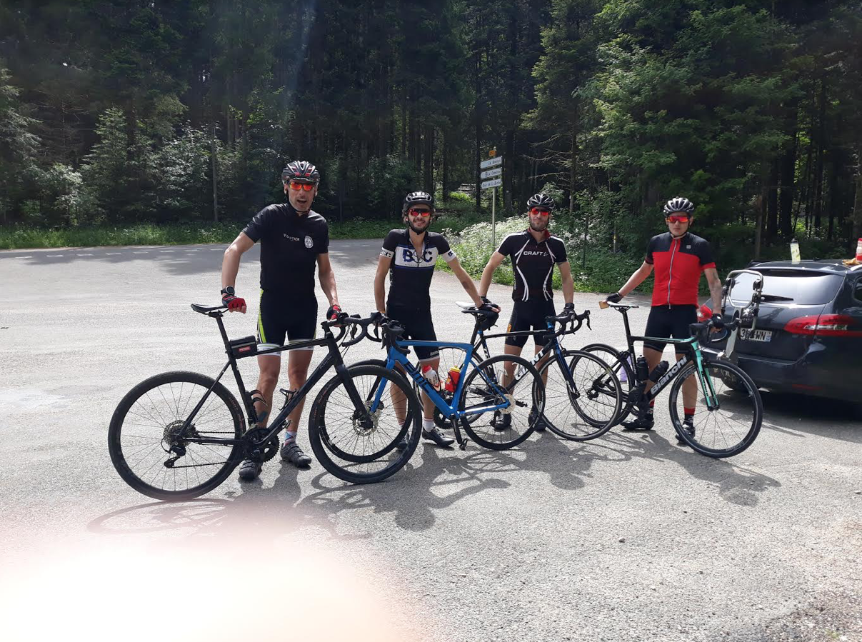 Jour 3 : Au matin rendez-vous à la gare de Montbéliard pour faire la grande traversée du Jura avec Thibault, Daniel et Anthony. Ils arrivent avec leurs vélos de course, frais. Je suis un peu fatigué, un peu mal aux fesses et j’ai bien peur que le gravel va faire office de tracteur sur la journée. Il va falloir appuyer sur les pédales pour suivre les gaziers. Ma chance c’est que l’on est suivi par Patrice en voiture. Je peux donc déposer mon sac et gagner quelques précieux kilos. Le parcours est fantastique. Des petites routes sans circulation, des paysages incroyables dans la continuité des Vosges mais avec plus d’ouverture. C’est un régal. On passe chacun par des coup de bien et moins bien. Sacha nous rejoint à 60 kil de l’arrivée et nous aide à franchir le plateau de Pontarlier un peu moins glop que le reste du parcours. Nous terminons cette étape à la Chapelle des Bois bien calmé. L’accueil du soir est excellent 😉
